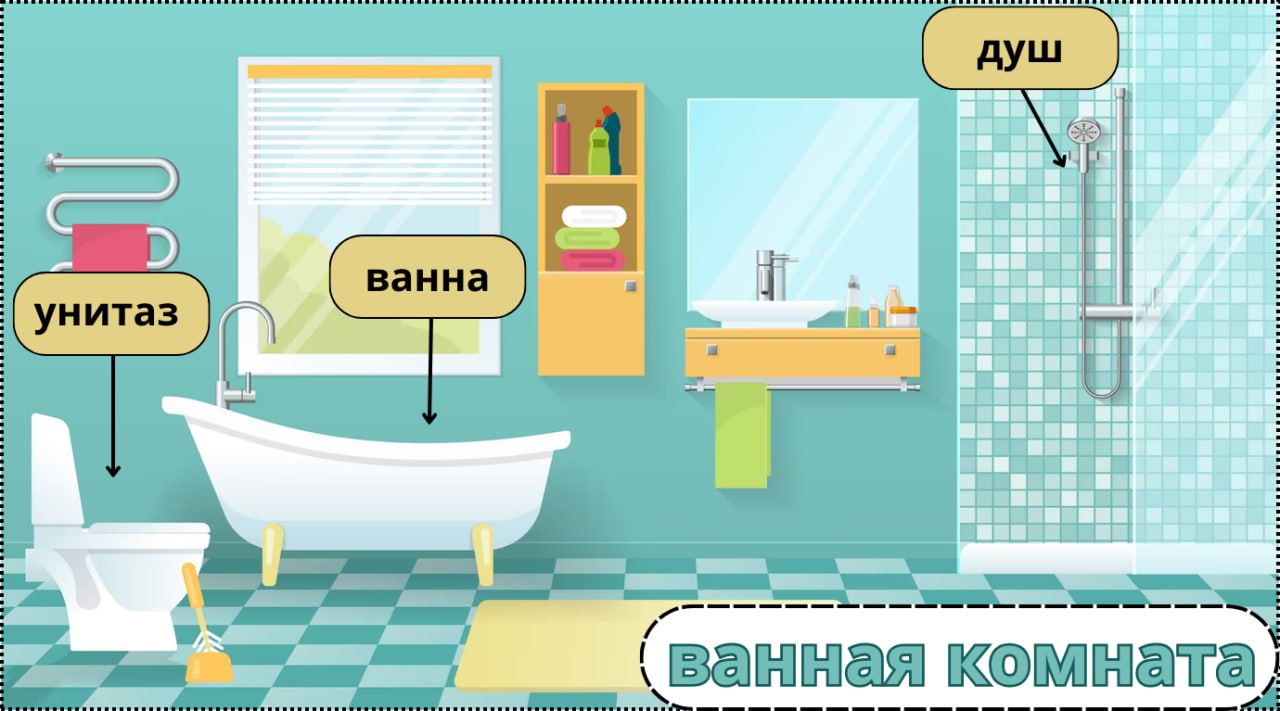 Ванная – это комната. Правильно называть её «ванная комната», но мы говорим просто «ванная». Здесь обычно находятся стиральная машина, ванна и душ. А ещё в ванной можно найти шампунь, мыло и полотенца.